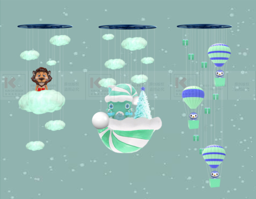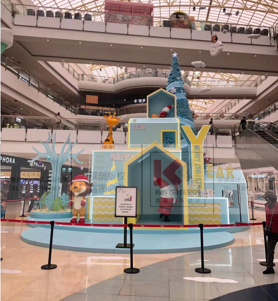 造夢拾光 · 藍至沓來是以圣誕老人的傳統(tǒng)元素為主并結(jié)合北歐童話樹屋對中 庭進行設(shè)計。整體配色偏網(wǎng)紅風(fēng)格,讓潮流和傳統(tǒng)元素進行碰撞,給所有人一個 耳目一新的圣誕購物體驗。整體設(shè)計上結(jié)合了美陳表現(xiàn)方法展現(xiàn)圣誕老人幾個生 活化場景,營造一個溫馨浪漫的氛圍,從而引起顧客對童年幻想的情感共鳴,達 到刺激消費的目的。還可以讓顧客在多維度內(nèi)去感受商場的魅力,從而達到對商 場宣傳效果的傳播,提升顧客的購物體驗和粘性。